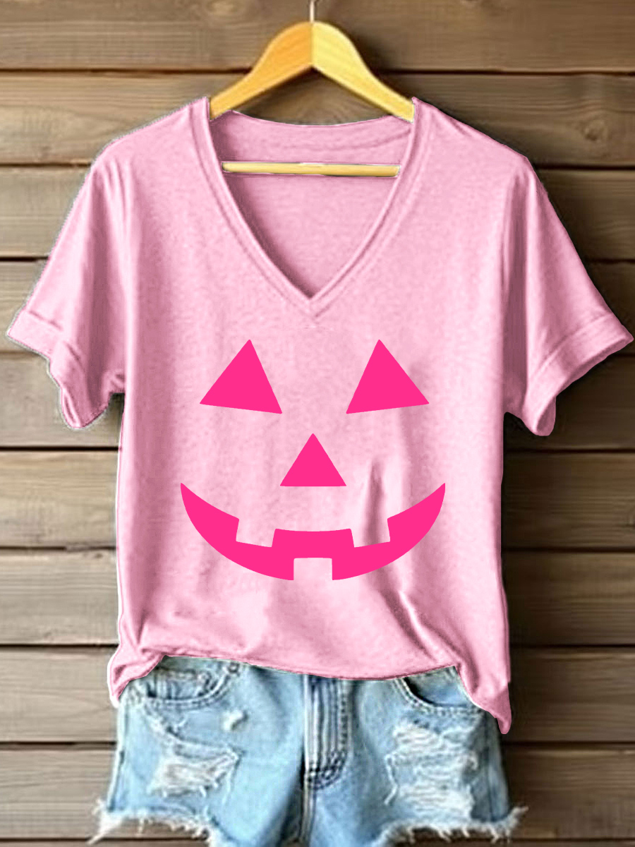 Women's Pink Pumpkin Face Print V-Neck T-Shirt