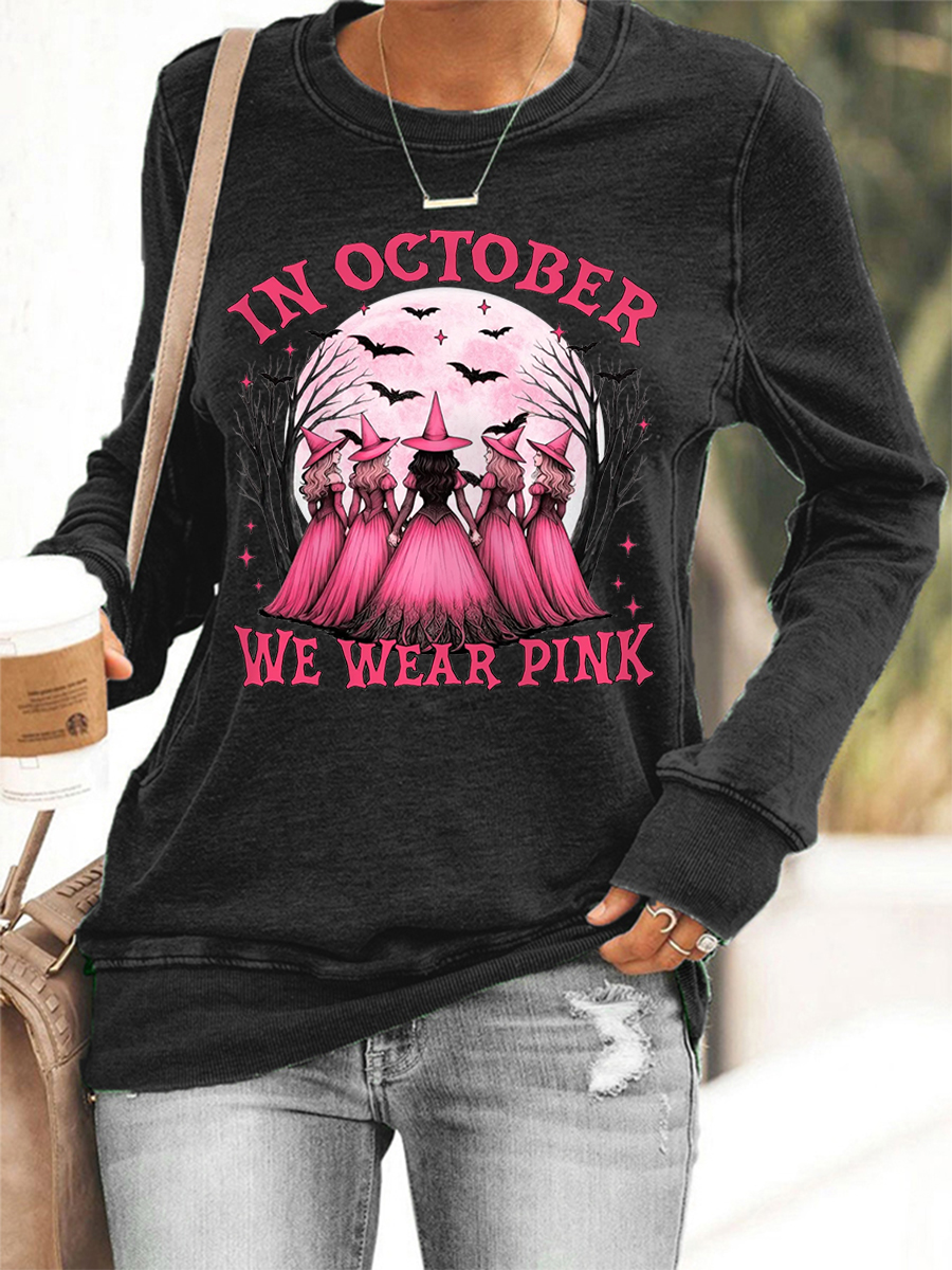 Women's In October We Wear Pink Halloween Witch Print Breast Cancer Awareness Sweatshirt