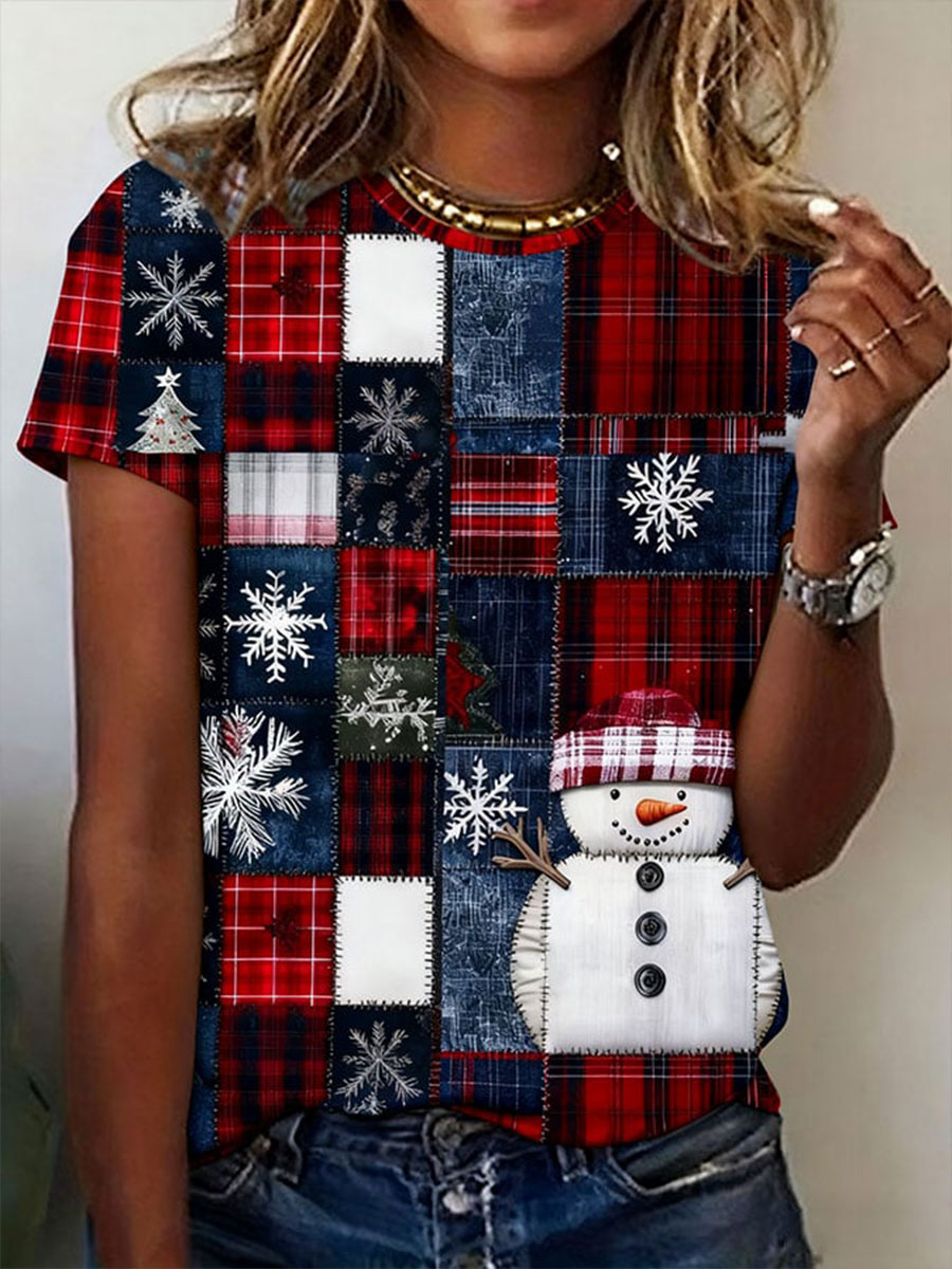Women's Plaid Patchwork Christmas Snowman Short-sleeved T-shirt