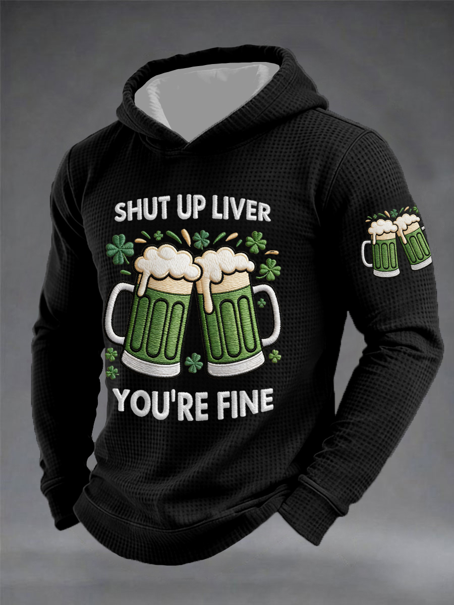 Men's Funny St. Patrick's Day Shut Up Liver You're Fine Green Beer Print Casual Waffle Hoodie