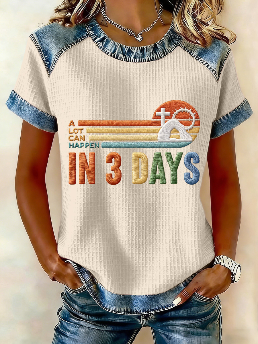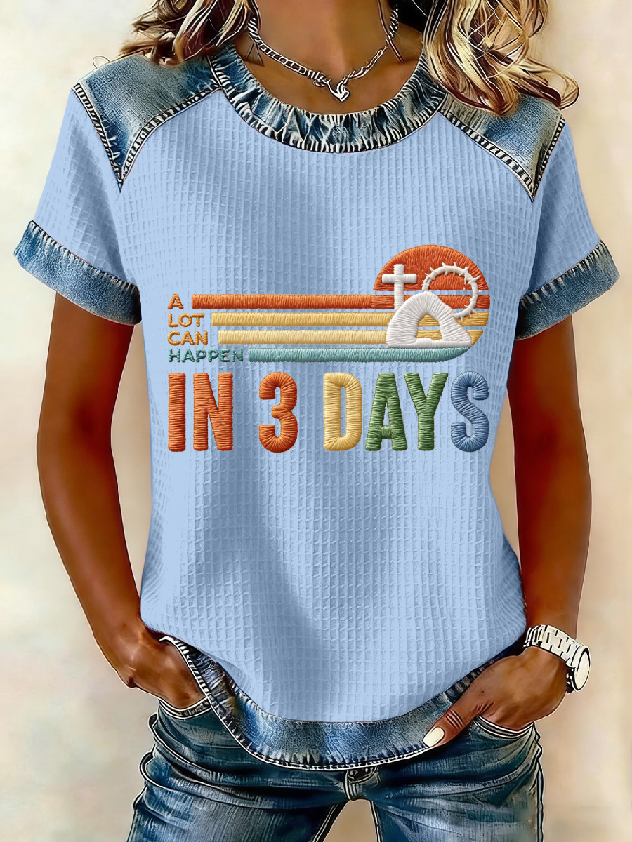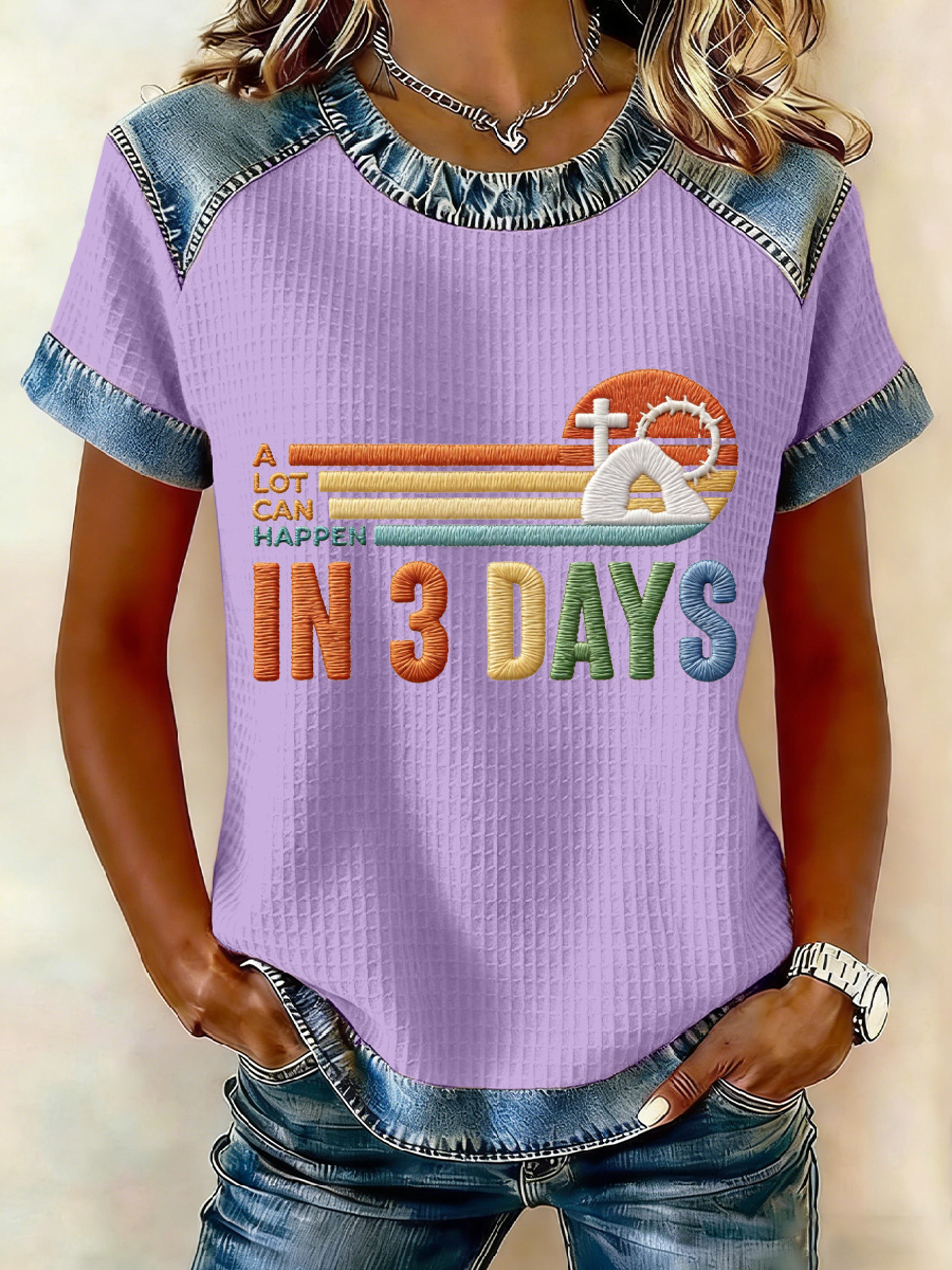 Women's A Lot Can Happen In 3 Days Embroidery Pattern Denim Patchwork Top