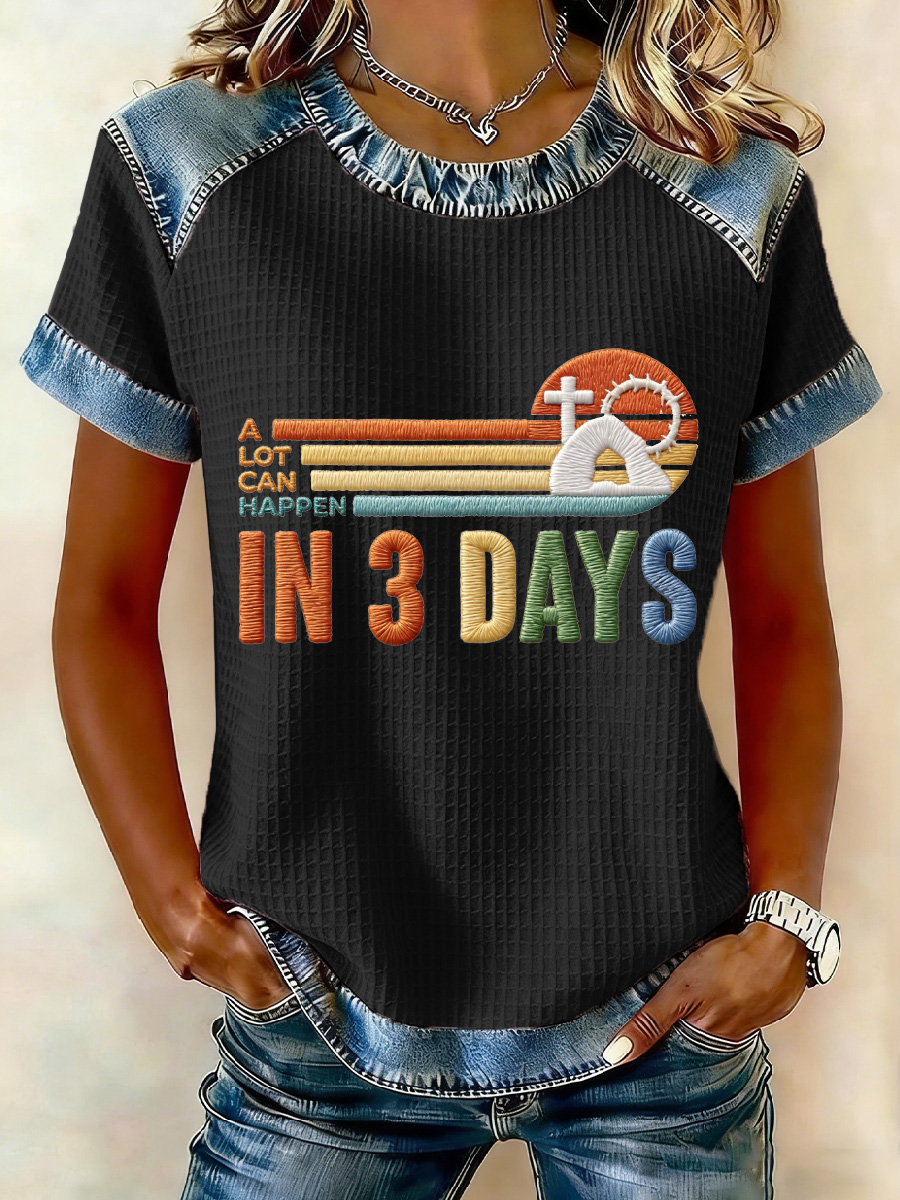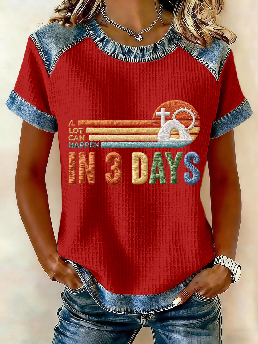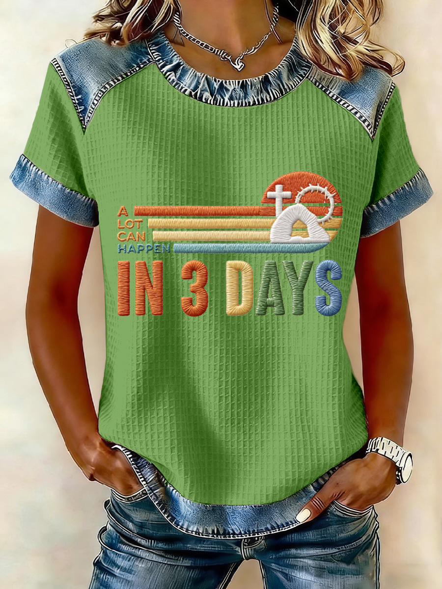 Women's A Lot Can Happen In 3 Days Embroidery Pattern Denim Patchwork Top
