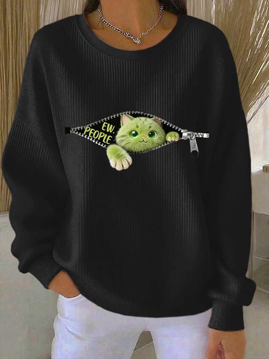 Women's EW People Green Cat Ribbed Round-Neck Sweatshirt