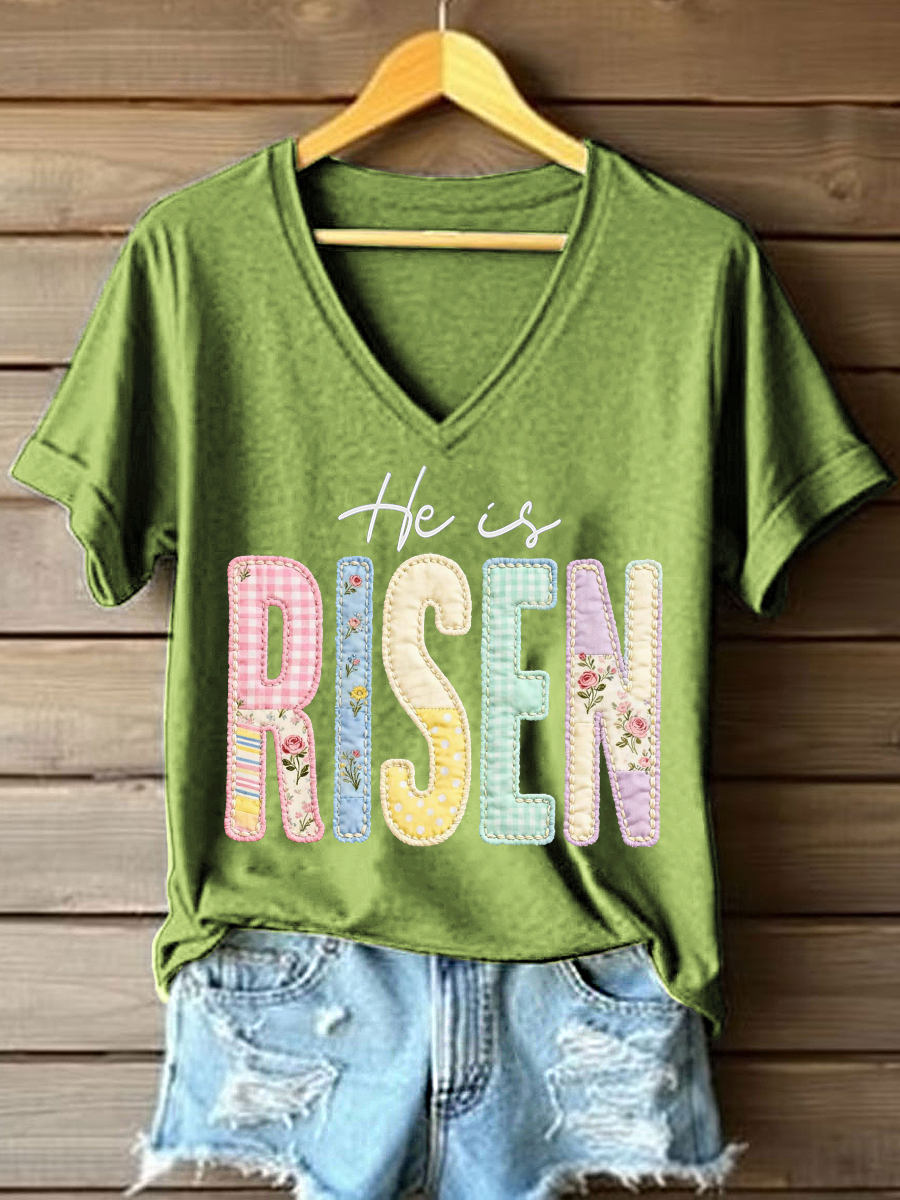 Women's He is Risen Patchwork Pattern V-Neck T-Shirt