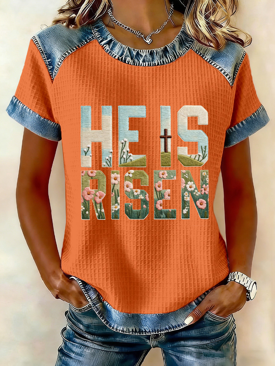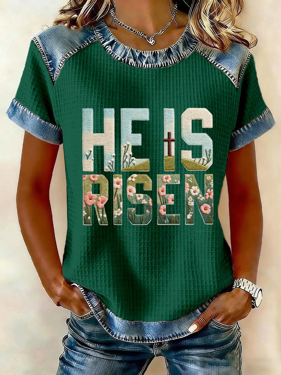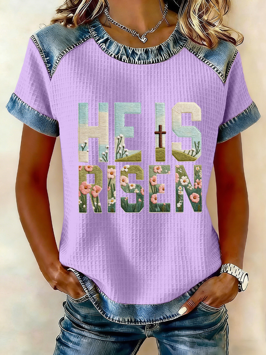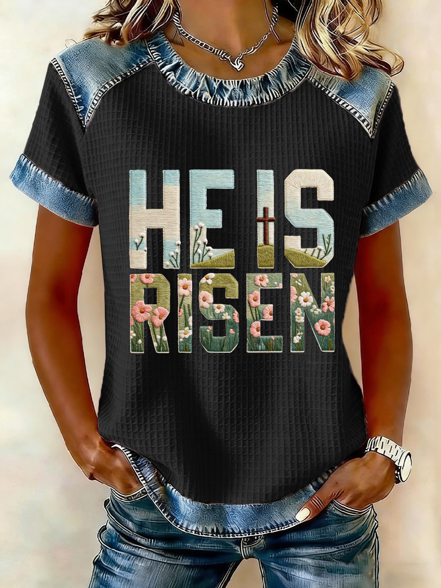Women's He is Risen Wildflower Embroidery Pattern Denim Patchwork Top