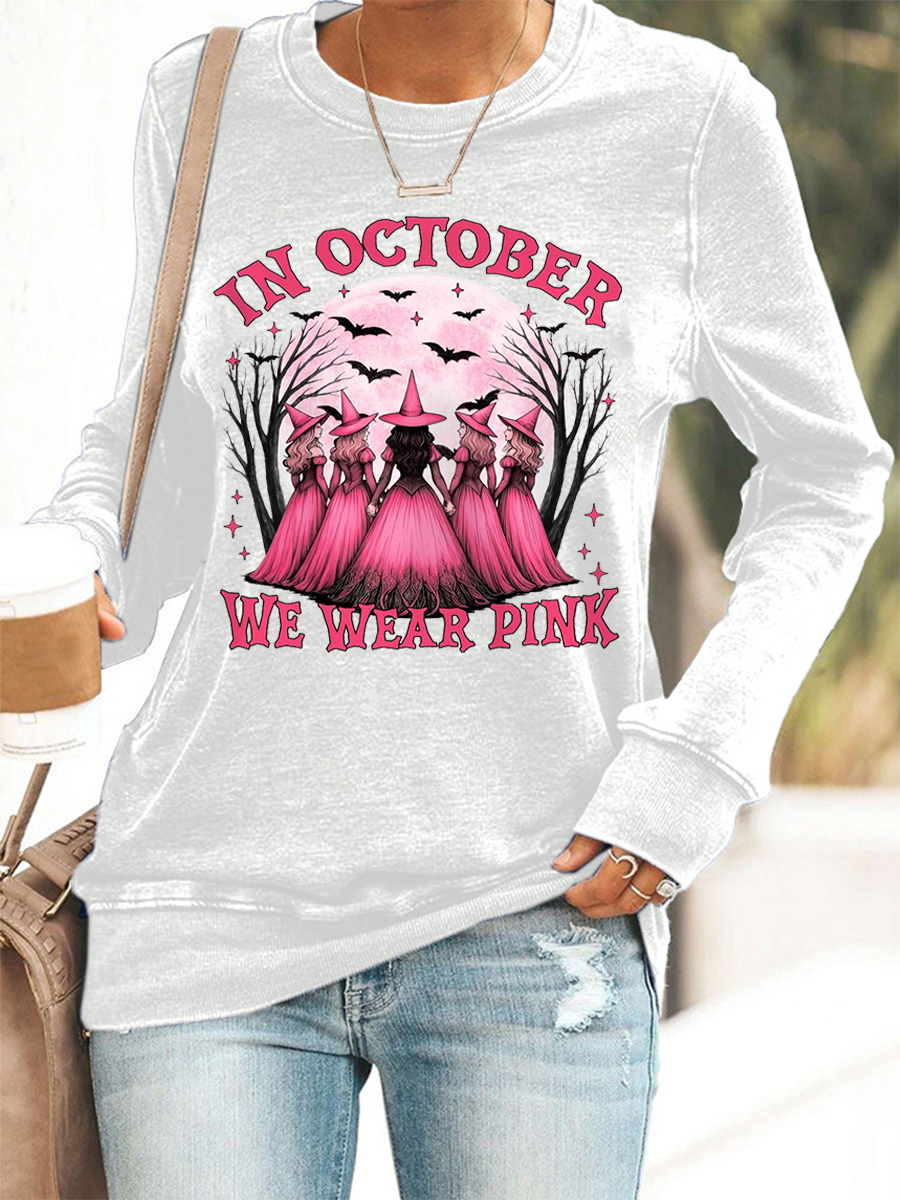 Women's In October We Wear Pink,Pink Halloween Witch Print Breast Cancer Awareness Sweatshirt